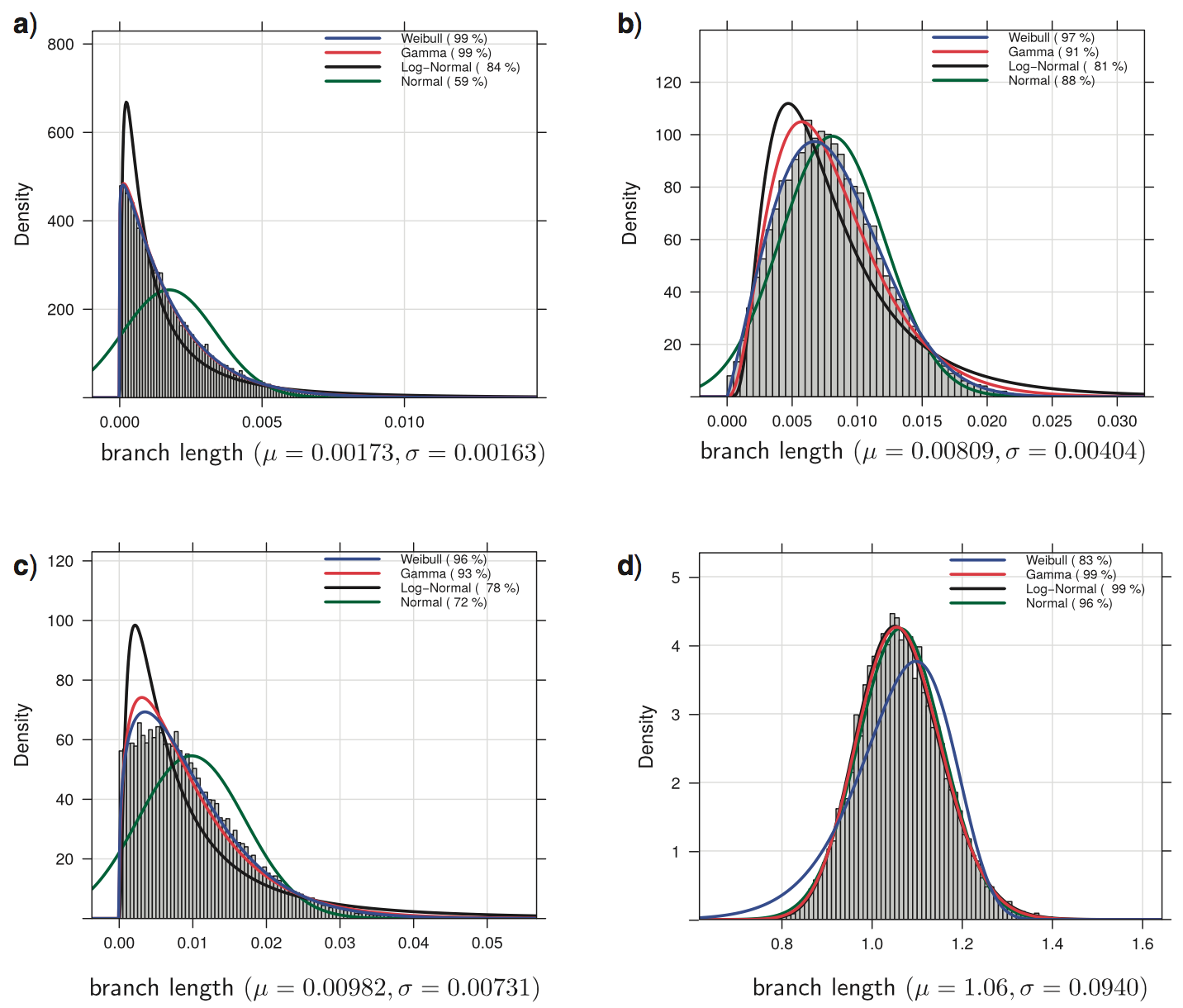 - Approximate distribution of one branch length using a parametric distribution (Aberer et al. 2016)