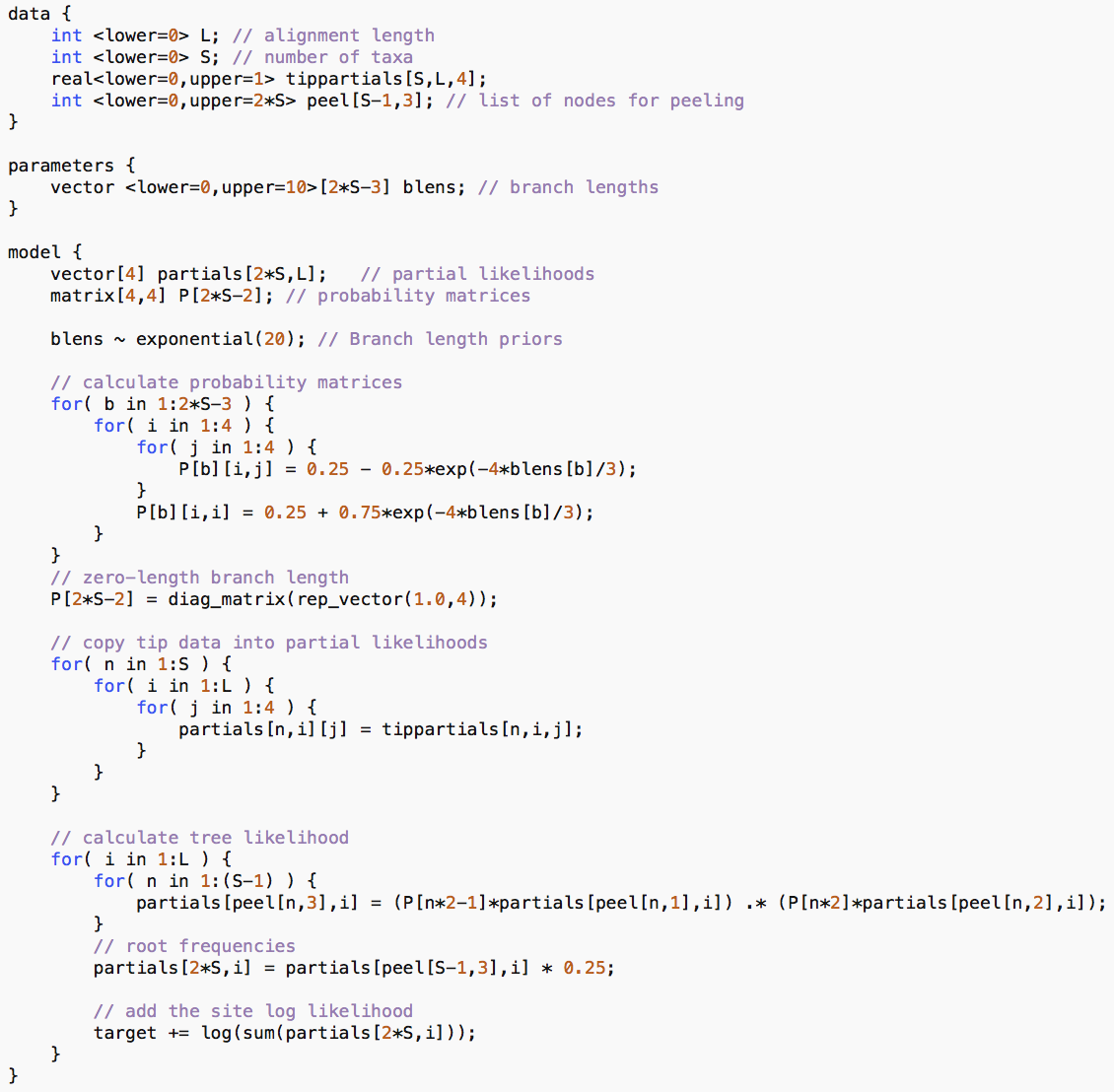 - Not possible in Stan, working on a specialised phylogenetic variational program